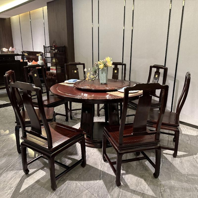 Вы можете быть уверены, что купите азиатские наборы круглых обеденных столов на нашем заводе. Отборное черное дерево, твердая древесина, тонкая текстура, источающая глубокий и загадочный блеск. Каждый кусок дерева тщательно отбирается, чтобы обеспечить идеальное качество. Он тщательно производится фабрикой красного дерева Чуаньтяньцзян. Черное дерево придает ему неповторимую фактуру, а лицу приходит ощущение стабильности и величия. Структура пазов и шипов унаследовала тысячелетнее мастерство и чрезвычайно прочна без гвоздей или клея. Это не только мастерство, но и культурное наследие, показывающее мудрость и изобретательность древних. Использование врезной и шиповой конструкции является традиционным и изысканным, что делает конструкцию круглого стола стабильной и может использоваться в течение длительного времени.