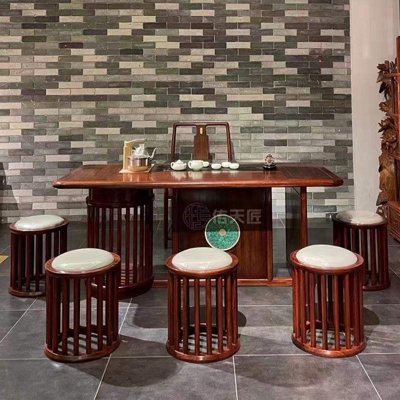 Классический чайный столик из палисандра в китайском стиле — это среда обитания души и место сбора дружбы. Здесь заварите чайник ароматного чая и вкусите спокойствие и красоту жизни. В переливающемся чайном аромате почувствуйте течение времени и насладитесь моментом досуга. Он тщательно изготовлен из черного дерева и поставляется с фабрики красного дерева Чуаньтяньцзян. Сделайте жизнь вкуснее, а время поэтичнее. Чайный столик можно легко подобрать, а кресла и табуреты можно комбинировать по мере необходимости.